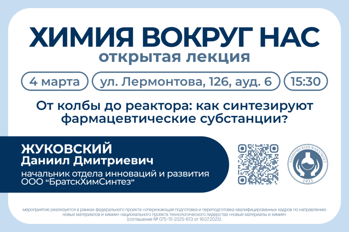 - Тема лекции: От колбы до реактора: как синтезируют фармацевтические субстанции.
